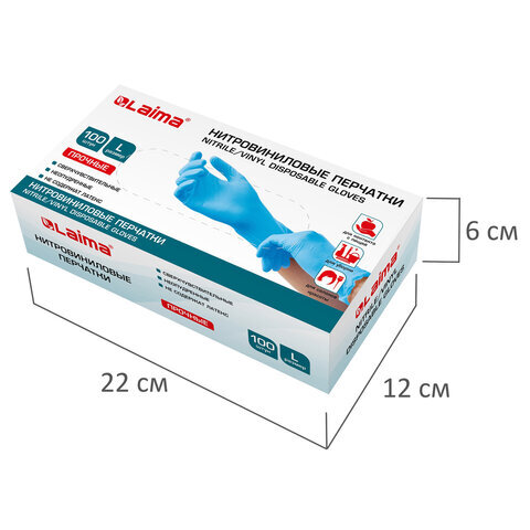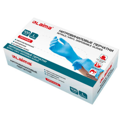 Перчатки одноразовые нитровиниловые голубые, 50 пар (100 штук), размер L (большие), LAIMA, 608058