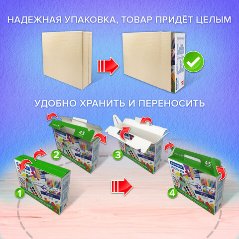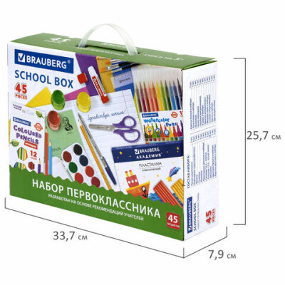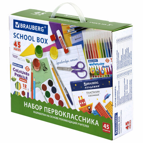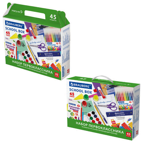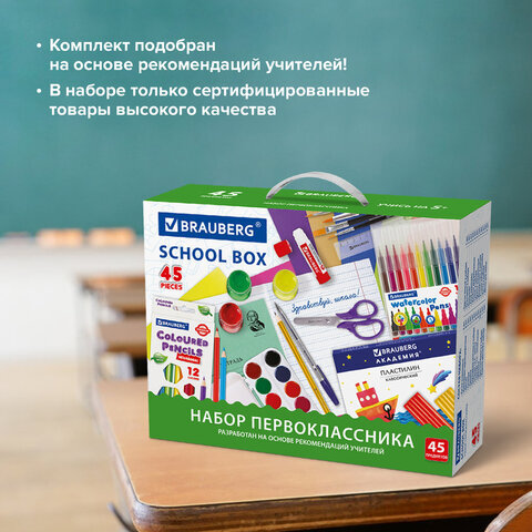 Набор школьных принадлежностей в подарочной коробке BRAUBERG "НАБОР ПЕРВОКЛАССНИКА", 45 предметов, 880122