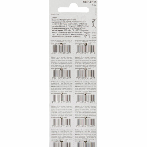 Батарейки КОМПЛЕКТ 10 шт., GP Alkaline, 189A (G10, LR54), алкалиновые, отрывной блок, 189FRA-2C10