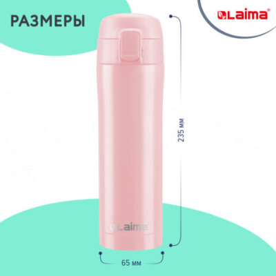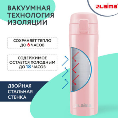 • Термокружка LAIMA с двойной стальной стенкой изготовлена из нержавеющей стали марки 304 медицинского уровня. Сконструирована по вакуумной технологии.