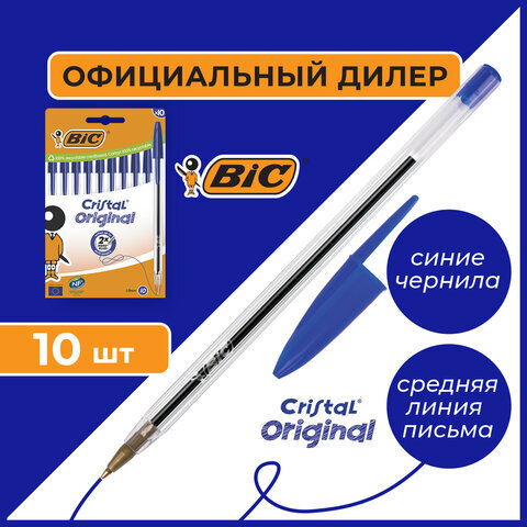 Ручки шариковые BIC "Cristal Original", НАБОР 10 шт., СИНИЕ, узел 1 мм, линия письма 0,32 мм, пакет, 830863