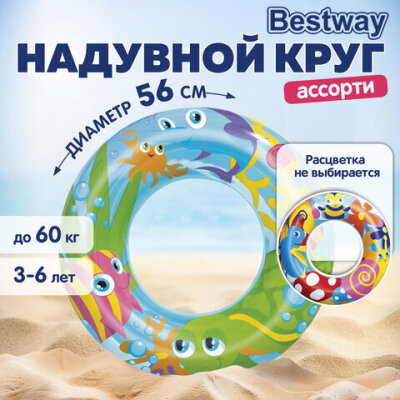 Надувной круг для плавания, диаметр 56 см, 3-6 лет, до 60 кг, АССОРТИ, BESTWAY, 36013