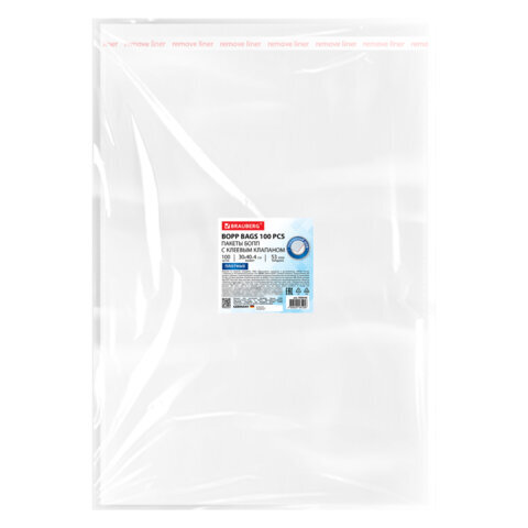 Пакеты БОПП с клеевым клапаном, КОМПЛЕКТ 100 штук, 30х40 + 4 см, 53 мкм, с усиленным швом, BRAUBERG, 700418