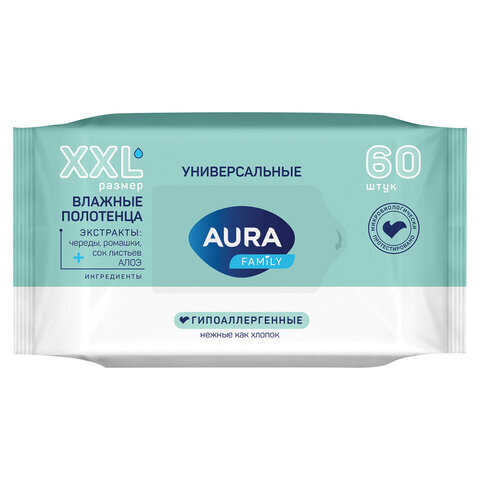 Полотенца влажные 60 шт., XXL, AURA "Family", универсальные, 14403