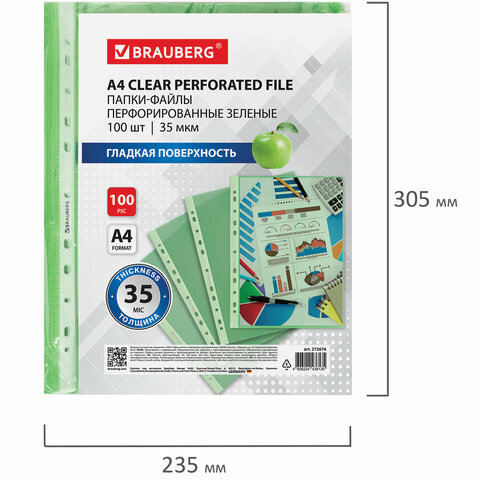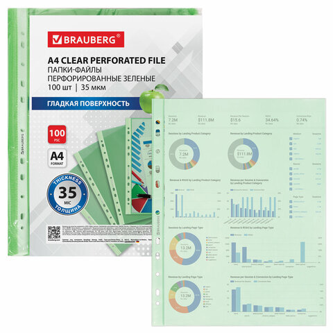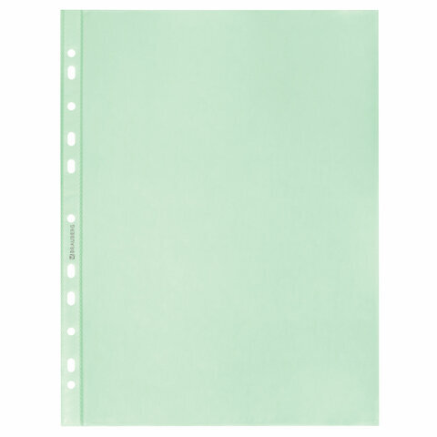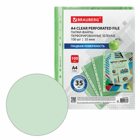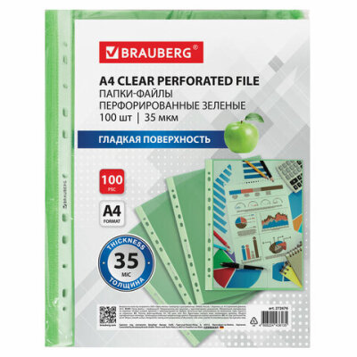 Папки-файлы перфорированные ЗЕЛЕНЫЕ А4 BRAUBERG, комплект 100 шт., гладкие, 35 мкм, 272676