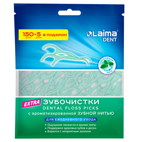 Зубочистки-флоссеры с зубной нитью "150 шт. + 5 шт. в подарок!", ВКУС МЯТЫ, зиплок-пакет, LAIMA DENT, 609403