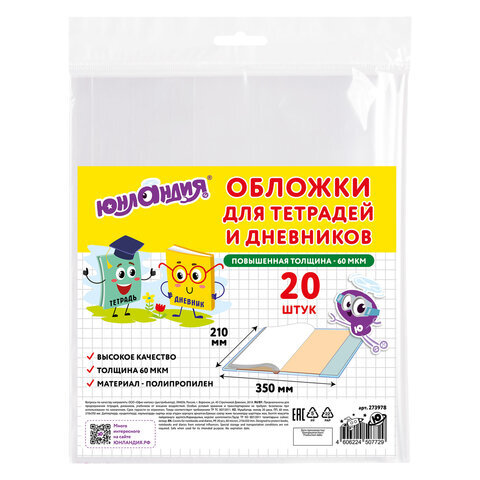 Обложки ПП для тетрадей и дневников, КОМПЛЕКТ 20 шт., 60 мкм, 210х350 мм, ЮНЛАНДИЯ, 273978