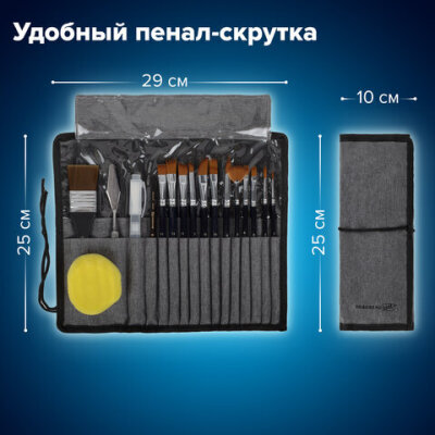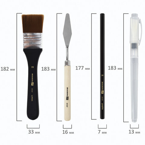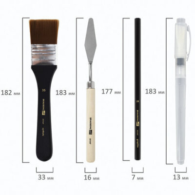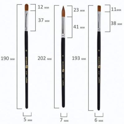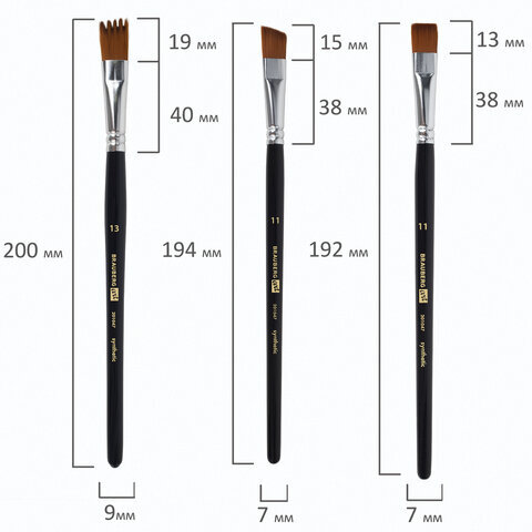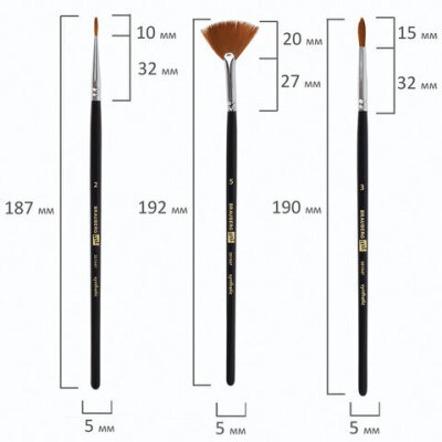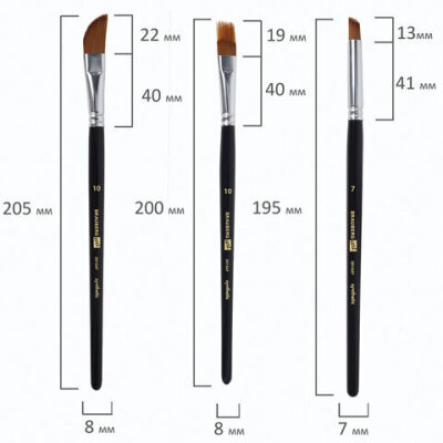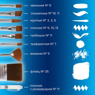 | Номер кисти | скошенные - № 10, 11; веерная - № 5; овальная - № 6; флейц - № 35; плоские - № 6, 10, 13; круглые - № 2, 3, 6; трафаретная - № 7; гребешок - № 11; плоская с резервуаром - № 11 |