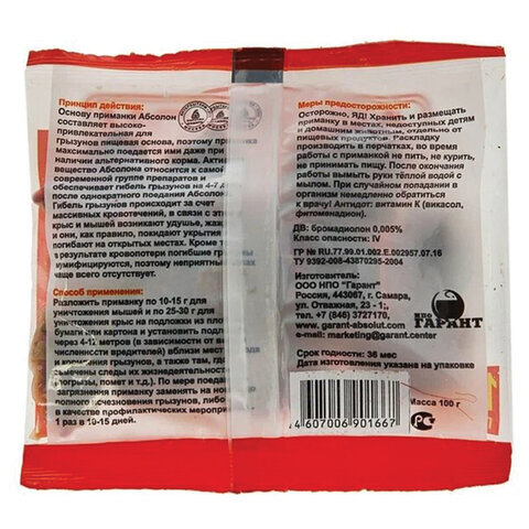 Приманка в парафинированных брикетах для уничтожения грызунов мумифицирующая 100 г, АБСОЛОН, АЛБПП100