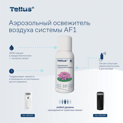 Аэрозольный освежитель воздуха Tellus позволяет эффективно контролировать запах в туалетной комнате при минимальных усилиях. Свежий цветочный аромат дарит ощущение чистоты.