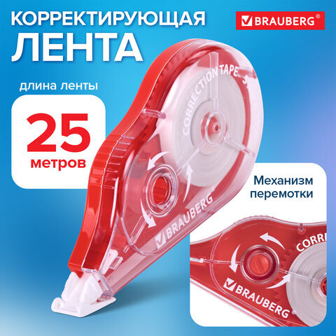 Корректирующая лента BRAUBERG MAXI PLUS, 5 мм х 25 м, механизм перемотки, корпус красный, блистер, 272501