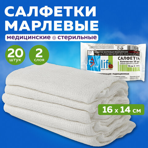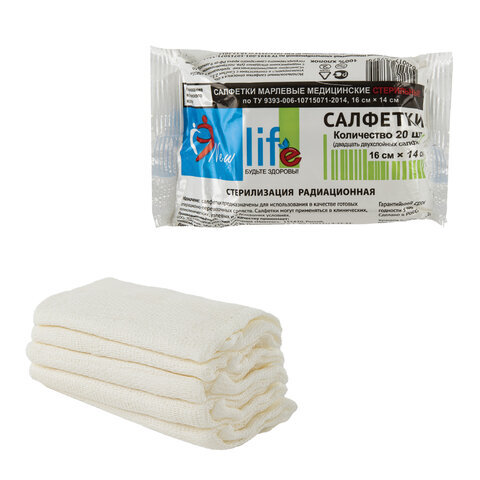 Салфетка марлевая стерильная NEW LIFE КОМПЛЕКТ 20 шт., 2 слоя, 16х14 см, плотность 36 (±2) г/м2, 121222