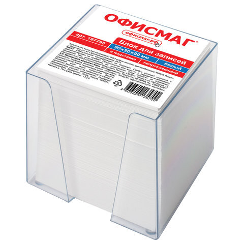 Блок для записей ОФИСМАГ в подставке прозрачной, куб 9х9х9 см, белый, белизна 95-98%, 127798