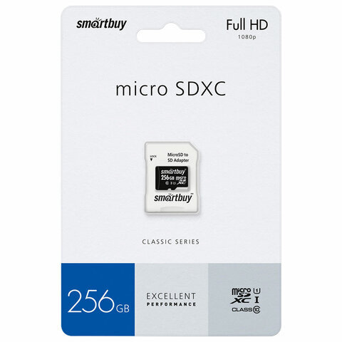 Карта памяти microSDXC 256 GB SMARTBUY, UHS-I, 90 Мб/сек (class 10), с адаптером, SB256GBSDCL10-01