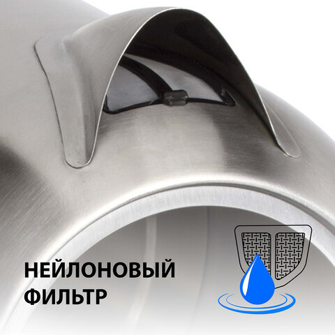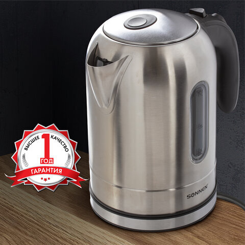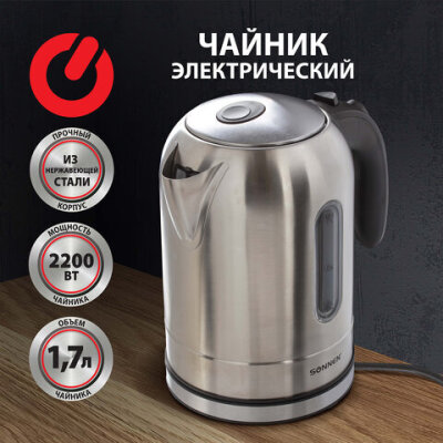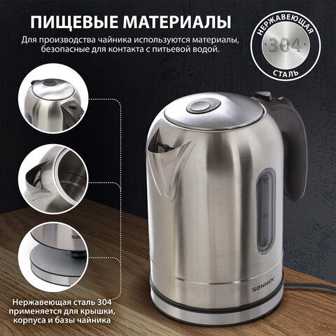 Чайник SONNEN KT-1755, 1,7 л, 2200 Вт, закрытый нагревательный элемент, нержавеющая сталь, 453419