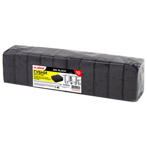 Губки для посуды 9,5х7х3,5 см, КОМПЛЕКТ 10 шт., BIG BLACK, КРУПНОПОРИСТЫЙ поролон с абразивным слоем, LAIMA, 608650