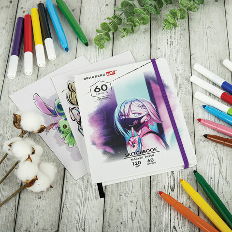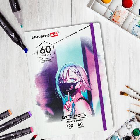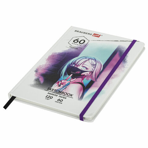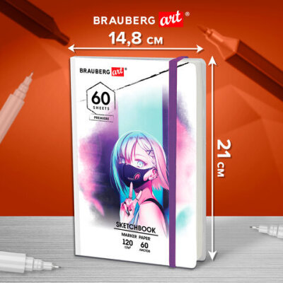 Скетчбук для маркеров 120 г/м2, 148х210 мм, 60 л., твердая обложка, резинка, BRAUBERG ART PREMIERE, Аниме, 115102