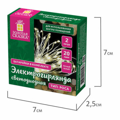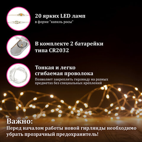 Электрогирлянда-нить комнатная "Роса" 2 м, 20 LED, теплый белый свет, на батарейках, ЗОЛОТАЯ СКАЗКА, 591931