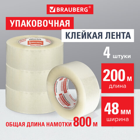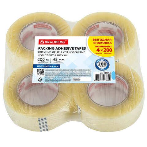 Клейкие ленты упаковочные, 48 мм х 200 м, КОМПЛЕКТ 4 шт., прозрачные, толщина 45 микрон, BRAUBERG, 440078