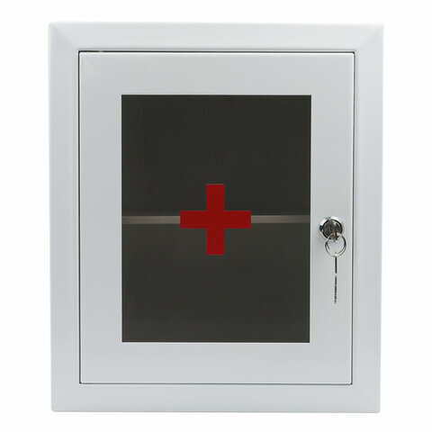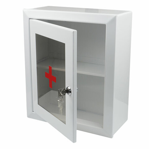 Металлический аптечный шкаф со стеклом. Классический внешний вид, надежная конструкция. Предусмотрено крепление на стене, закрывается на замок.