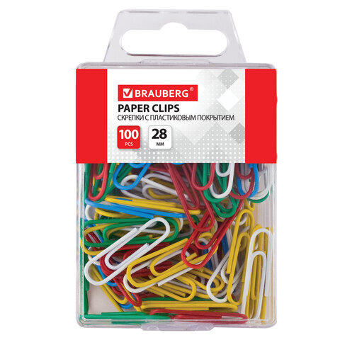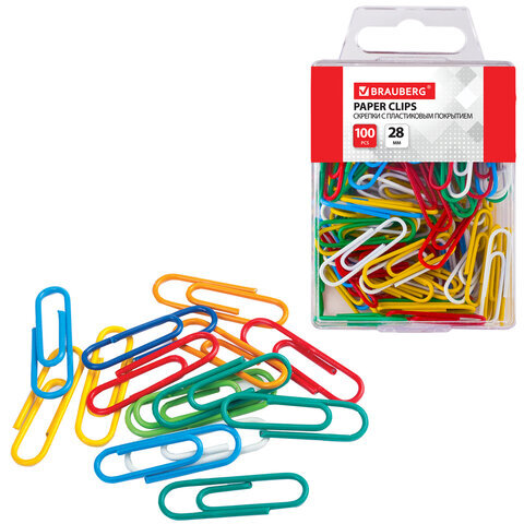Скрепки BRAUBERG, 28 мм, цветные, 100 шт., в пластиковой коробке, 221111