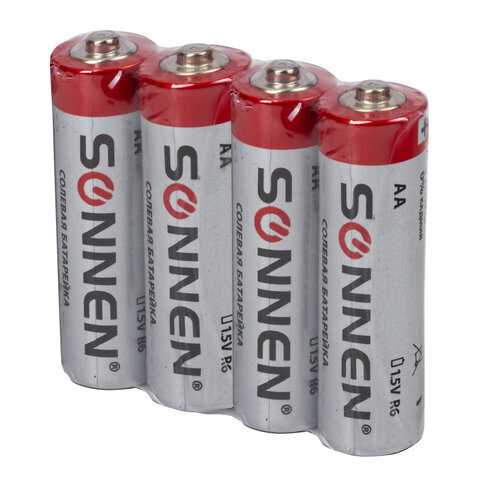 Батарейки КОМПЛЕКТ 4 шт., SONNEN, АА (R6, 15А), солевые, пальчиковые, в пленке, 451097
