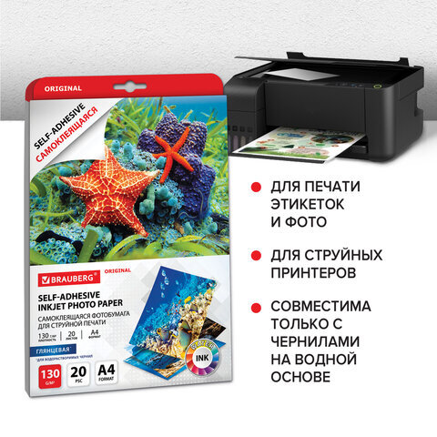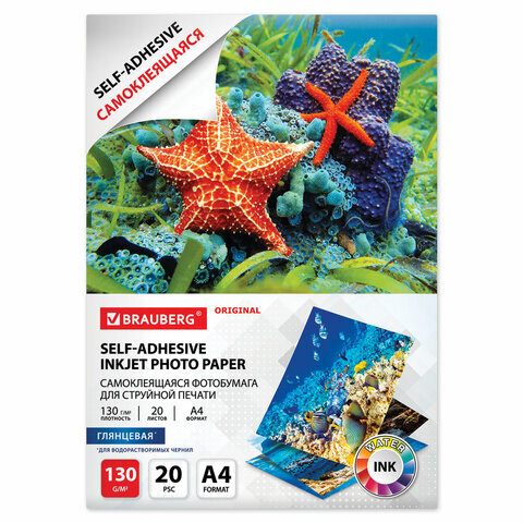 Фотобумага САМОКЛЕЯЩАЯСЯ глянцевая, А4, 130 г/м2, 20 листов, BRAUBERG ORIGINAL, 364007