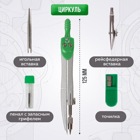 | Комплектация | игольная вставка, пенал с запасным грифелем, рейсфедерная вставка, точилка, циркуль |