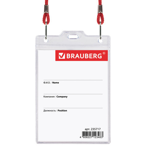 Бейдж вертикальный БОЛЬШОЙ (120х90 мм), на красном шнурке 45 см, 2 карабина, BRAUBERG, 235717