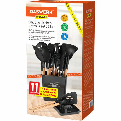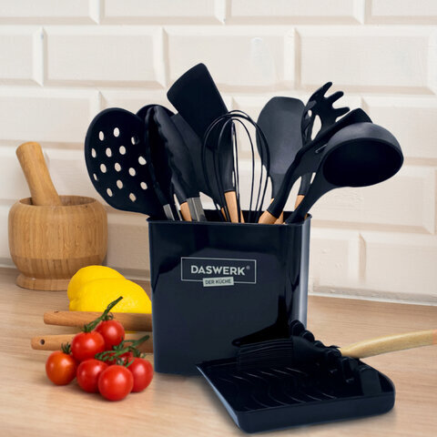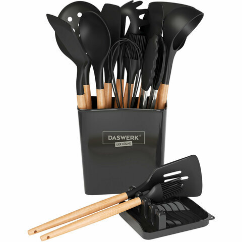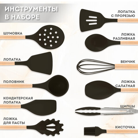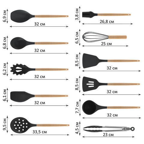 | Состав набора | лопатка для жарки, шпатель, венчик, щипцы, плоская ложка для выпечки, лопатка с отверстиями для слива масла, половник, ложка для салата, кисточка для масла, ложка для спагетти и шумовка, подставка, держатель из пластика |
