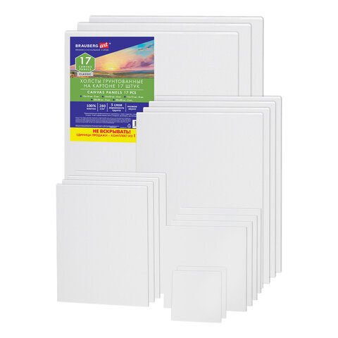 Холсты на картоне НАБОР 17 штук, хлопок, грунт, 280 г/м2, BRAUBERG ART CLASSIC, 192657