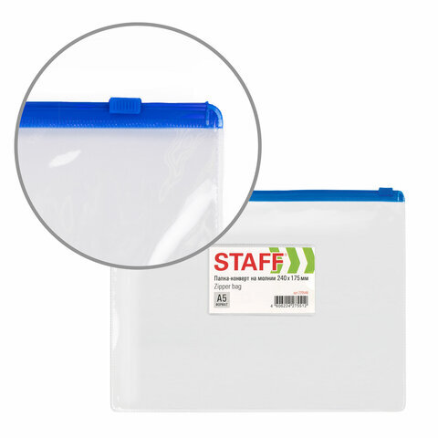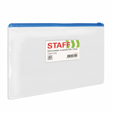 Папка-конверт на молнии МАЛОГО ФОРМАТА (240х175 мм), А5, карман для визиток, прозрачная, 0,12 мм, STAFF, 229548