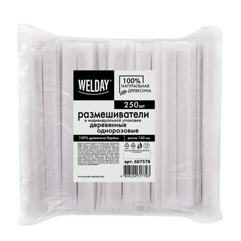 Размешиватель одноразовый деревянный в индивидуальной упаковке 140 мм, КОМПЛЕКТ 250 шт., WELDAY (ВЭЛДЭЙ), 607578