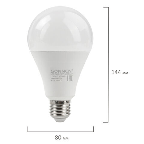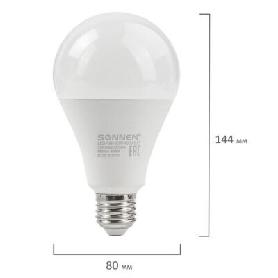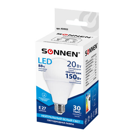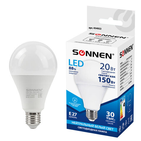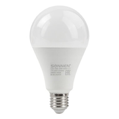 Лампа светодиодная SONNEN, 20 (150) Вт, цоколь Е27, груша, нейтральный белый, 30000 ч, LED A80-20W-4000-E27, 454922