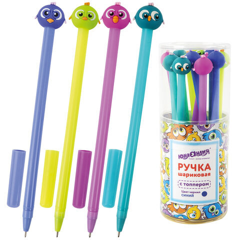 Ручка с топпером шариковая ЮНЛАНДИЯ "Птенец", корпус ассорти, СИНЯЯ, пишущий узел 0,7 мм, 143811