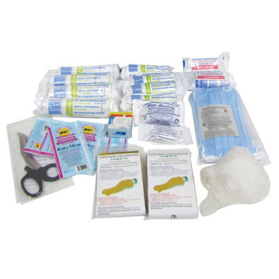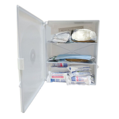 Аптечка первой помощи работникам в пластиковом шкафу рассчитана на оказание помощи ориентировочно 10 пострадавшим.