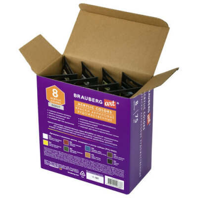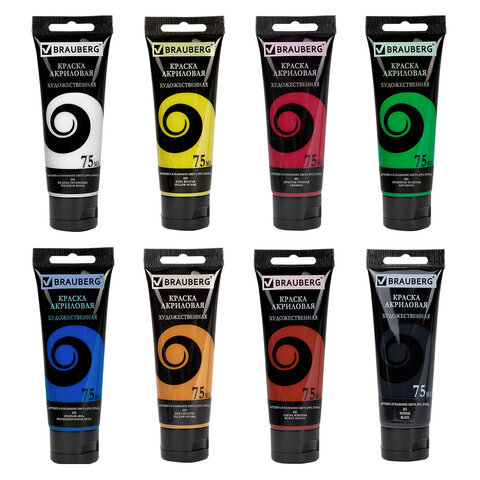 Краски акриловые художественные матовые 8 цветов в тубах по 75 мл, BRAUBERG ART DEBUT, 192418