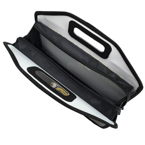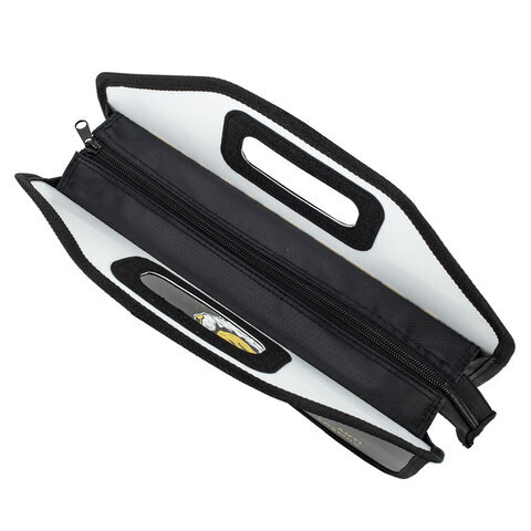 Папка-сумка на молнии с ручками ЮНЛАНДИЯ выполнена из пластика, имеет уплотненные фетром двойные ручки в корпусе, по по краям окантована тканью. Застежка-молния расположена по верхнему краю папки.