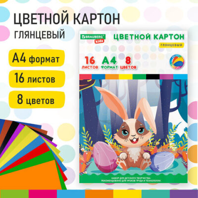 Картон цветной А4 МЕЛОВАННЫЙ, 16 листов, 8 цветов, в папке, BRAUBERG KIDS, 200х290 мм, "Зайчик", 115159
