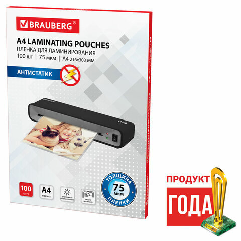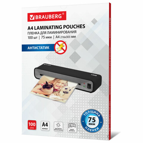 Пленки-заготовки для ламинирования АНТИСТАТИК, А4, КОМПЛЕКТ 100 шт., 75 мкм, BRAUBERG, 531792