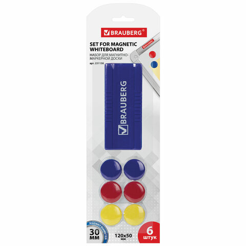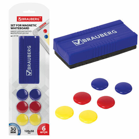 Набор для магнитно-маркерной доски (магнитный стиратель, магниты 30 мм - 6 шт., цвет ассорти), блистер, BRAUBERG, 231158