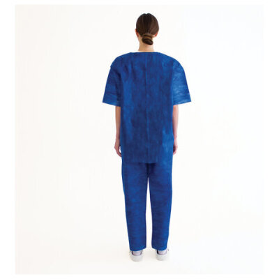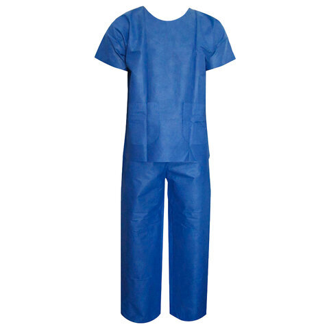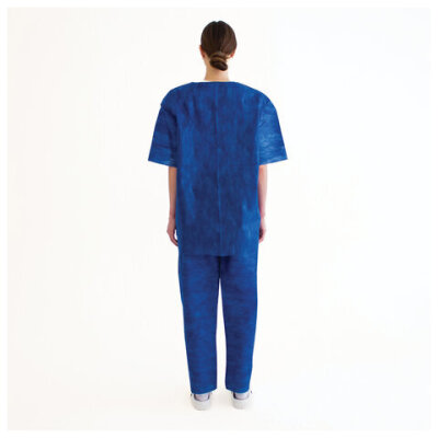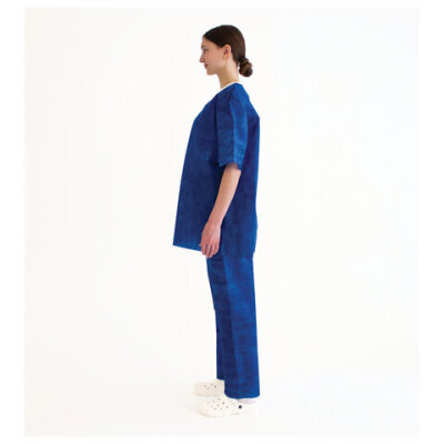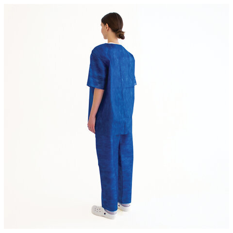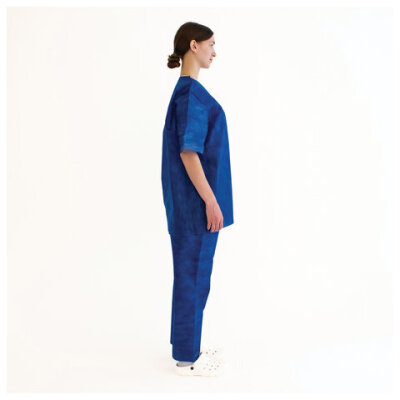 Костюм хирургический синий ГЕКСА изготовлен из плотного спанбонда. Рубашка прямого силуэта без застежки, рукав короткий. Брюки прямые, без бокового шва, с завязками на уровне талии.