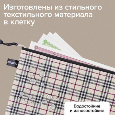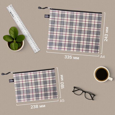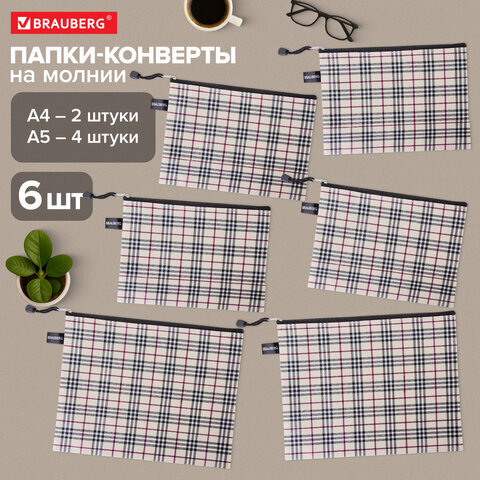Папка-конверт СУПЕР КОМПЛЕКТ на молнии, 6 штук (А4 - 2 шт., А5 - 4 шт.), ткань в клетку, BRAUBERG, 271350