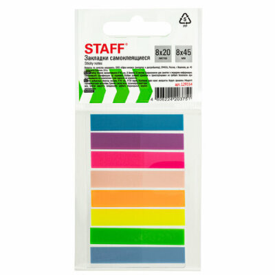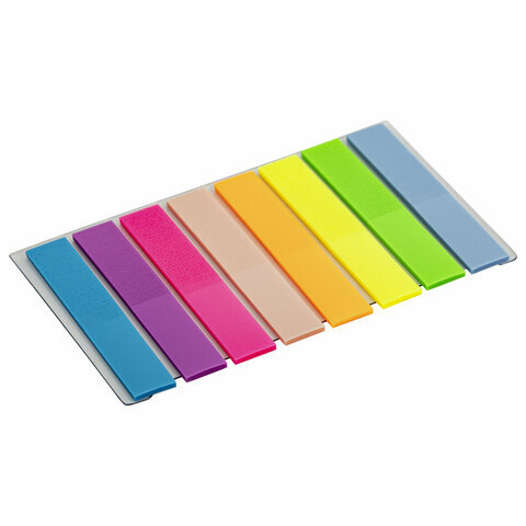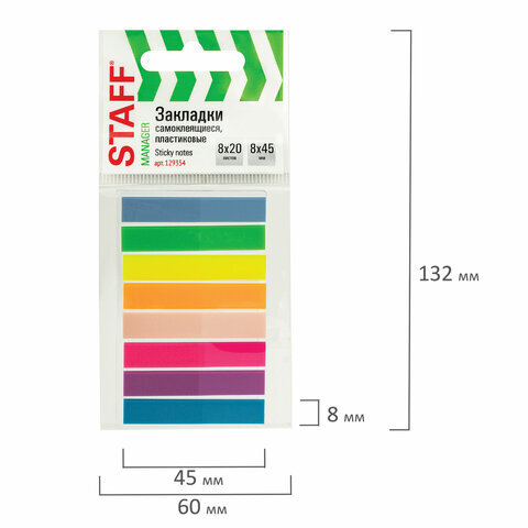 Закладки клейкие неоновые STAFF, 45х8 мм, 160 штук (8 цветов х 20 листов), на пластиковом основании, 129354