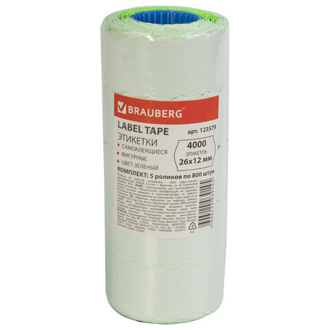 Этикет-лента 26х12 мм, волна, зеленая, комплект 5 рулонов по 800 шт., BRAUBERG, 123579