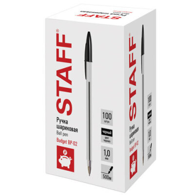 Ручка шариковая STAFF Basic Budget BP-02, письмо 500 м, ЧЕРНАЯ, длина корпуса 13,5 см, линия письма 0,5 мм, 143759