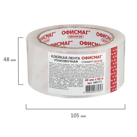 Клейкая лента упаковочная 48 мм х 66 м, прозрачная, толщина 45 микрон, ОФИСМАГ СТАНДАРТ, 440173