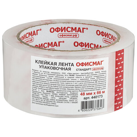 Упаковочная клейкая лента ОФИСМАГ СТАНДАРТ предназначена для упаковки, применяется в торговле, промышленности, быту. С ее помощью можно склеить практически любые предметы: картонные коробки, упаковочную пленку, бумагу и т. д.