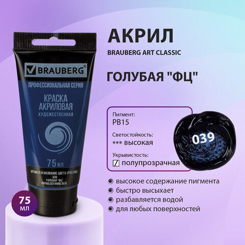 Краска акриловая художественная BRAUBERG ART CLASSIC, туба 75мл, ГОЛУБАЯ "ФЦ", 191096
