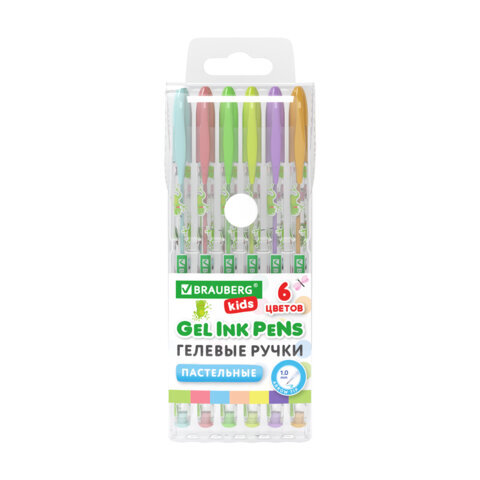 Ручки гелевые ПАСТЕЛЬНЫЕ BRAUBERG KIDS "CUTE ANIMALS", НАБОР 6 ЦВЕТОВ, корпус с печатью, узел 1 мм, линия письма 0,7 мм, 144439